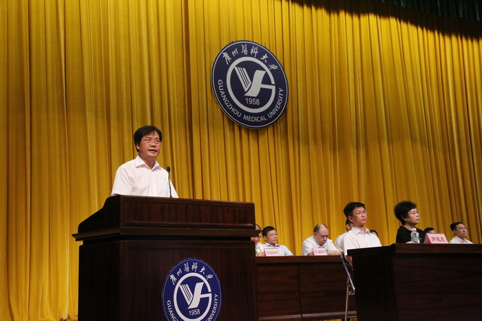 王新华校长代表学校对2015级新生表达热烈的欢迎。他说,今天是同学们入学第一课,关键词是“选择”,主题是“珍惜你的选择”。王校长表示,广东省今年全面启动了高水平大学建设工作,学校正面临新一轮的发展机遇,同学们的加入正当其时,希望同学们以自信自强的心态开启大学生活,树立崇高的职业目标,倍加珍惜在广医的学习时间,坚定信念,相信自己的选择,创造绚丽多彩的大学生活。