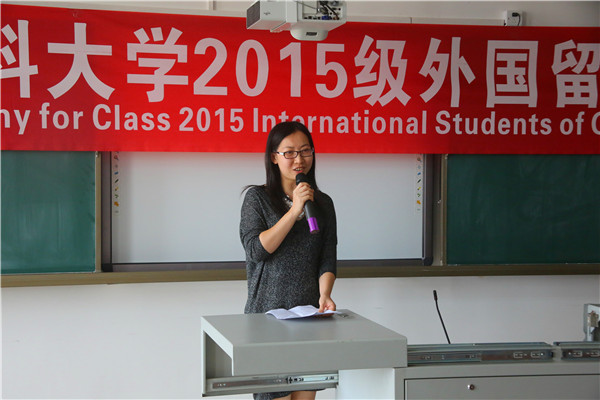 来自巴基斯坦的留学生noor代表在校生发言。她首先用汉语欢迎2015级新同学的到来,引起了新生们的极大兴趣。接着她和新同学分享了她在广医的学习和生活,希望师弟师妹们能热爱中国,喜爱中国文化,学习、传播中国文化,做和平友好的使者。
