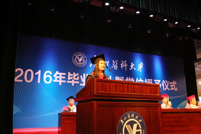 毕业典礼由副校长罗健东主持,副校长刘金保宣读优秀毕业生表彰决定及获奖名单,毕业生代表上台领奖。第二临床学院李叶梅同学和2010级留学生sinclair mosha同学、基础学院杜宝玲老师分别代表本科毕业生、毕业留学生和教师发言。