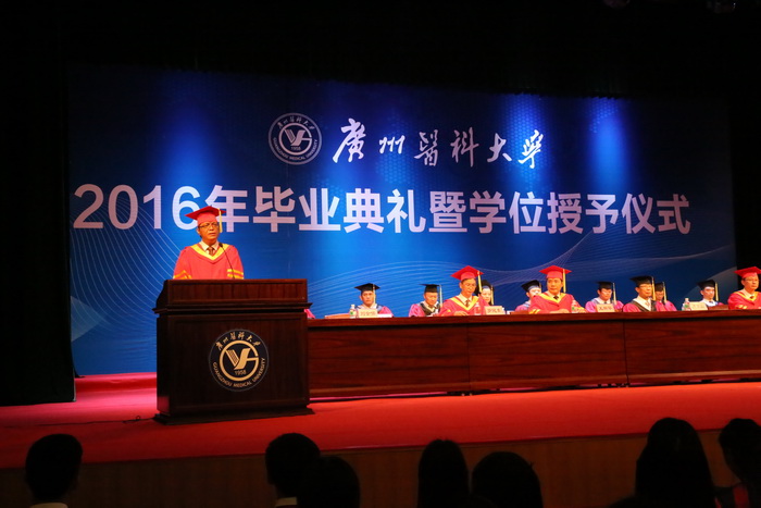 “今天是广医人一年一度最为盛大的节日,我们在这里欢聚一堂,为51位博士、560位硕士、1363位学士举行隆重的毕业典礼暨学位授予仪式。”王新华校长肯定了同学们在校期间取得的优异成绩和突出表现,感谢同学们对学校的理解、包容、支持与热爱。他以“夜空中最亮的星”为喻,希望同学们做梦想和信仰之星、创新和攀峰之星、大爱和奉献之星。他希望同学们把个人奋斗的理想与梦想融入到中华民族伟大复兴的中国梦,多学习中国历史,尤其是中国近现代史。多学习和弘扬中华文化,增强文化自信。还建议大家涉猎中医著作,把整体的、恒动的、平衡的和天人相应的观念融入职业生涯。他还以荣获第十一届光华工程科技奖成就奖的钟南山院士,在国际顶级期刊发表研究成果的附三院产科重大疾病重点实验室范勇博士研究团队,刚刚被评为“南粤百杰”、 其团队研究成果获2015年度国家科技进步奖二等奖的冉丕鑫教授,以及其他优秀学者为例,鼓励同学们要实现理想和目标,必须有坚韧不拔的意志和久久为功的毅力。“你们让广医的星空灿烂无比”, 最后,王校长祝福同学们踏上寻找真理、真心和真爱的旅程,充满积极、阳光的正能量,在今后的人生中找到“夜空中最亮的星”。