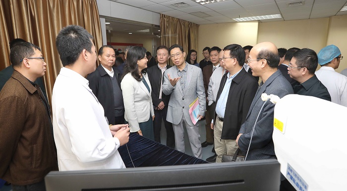在冉丕鑫书记、黄健清副校长等陪同下,余艳红副省长一行先来到医院重症医学科、胸外科及负压病区进行考察,详细了解了附属第一医院在突发公共卫生事件时的应急准备与防护救治措施,并专门参观并体验了由该院自主研制创新的裸眼3d手术系统及应用光学相干断层成像技术(oct),对该院在产学研方面所取得的成果表示赞赏。