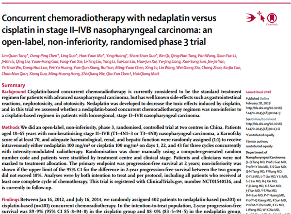 鼻咽癌是广东地区的常见病、多发病,因而也被称为“广东癌”。经过多年的探索努力,鼻咽癌的疗效不断提高,以顺铂为基础的同期放化疗是鼻咽癌治疗的标准方案。顺铂是第一代铂类药物,抗癌谱广,价格便宜,疗效好。然而,顺铂的副作用较为严重,例如呕吐、肾损伤、神经损伤等,因此,在使用顺铂时,需要大量水化,及联合使用多种高级别的止呕药物等。奈达铂是一种顺铂衍生物,具有相同的氨载体配体结构,但是离子基团不同,因此,奈达铂会降低顺铂造成的毒性作用,如肾毒性和胃肠道毒性。此外,奈达铂在临床中具有额外的优势,如不需要水化和利尿剂来保护肾脏。