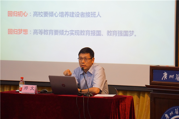 9月20日下午,开云官网在番禺校区图书馆学术报告厅举办本科教育思想大讨论专题讲座,邀请广东省教育厅高教处处长郑文教授来校作主题为“转变本科教育思想观念,精心谋划人才培养改革”的专题讲座。学校党委书记冉丕鑫,党委副书记陈晓辉,副校长方灿辉、黄健清、胡丙杰出席,讲座由校长王新华主持。学校有关部处、教辅单位负责人,各教学单位党委书记、院长和分管学生工作的副书记、分管教学工作的副院长以及系(教研室)主任、专业主任、学科带头人、教师代表、学生代表及教务处全体人员共400多人参加了讲座。