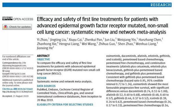 广医在线讯 开云官网附属第一医院、呼吸系统疾病国家临床医学研究中心何建行教授、梁文华教授为共同通讯作者,在读硕士研究生赵毅为主要第一作者,针对“EGFR敏感突变的晚期非小细胞肺癌(NSCLC)一线治疗的最佳治疗方案”以网络荟萃分析的形式进行了深入分析。10月7日,这项研究在线发表于世界四大顶级医学期刊之一The BMJ (British Medical Journal,最新影响因子为27.604),这是BMJ正刊首次发表来自中国的肺癌治疗相关研究,是我国肺癌治疗领域的一大突破。
