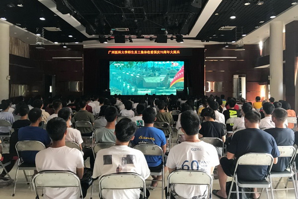 广医在线讯 壮阔七十载,奋进新时代。为发扬爱国情,汇聚报国志,10月1日上午8点,学校组织师生在番禺校区集中观看庆祝中华人民共和国成立70周年大会及阅兵式、群众游行等庆典活动直播。学校方灿辉副校长及相关部处负责人和师生代表观看了直播,为新中国成立七十年的光辉历程和伟大成就点赞。