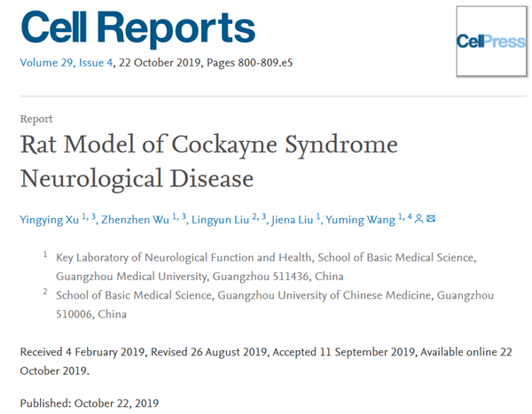 广医在线讯 近日,基础医学院神经科学实验室王玉茗教授团队在国际权威学术期刊Cell Reports杂志上在线发表了题为“Rat model of Cockayne syndrome neurological disease”的论文(论文链接:https://doi.org/10.1016/j.celrep.2019.09.028)。该研究成功构建了科凯恩氏综合症突变大鼠模型,发现了该突变鼠在DNA损伤修复缺陷和神经发育障碍方面与病人有类似的症状,证明了基因表达调控紊乱与大鼠模型出现的神经病理特征有关。该团队多年来致力于儿童神经系统罕见病的致病基因和发病机制研究,本研究成果为科凯恩氏综合症的临床诊治提供了宝贵的疾病动物模型。