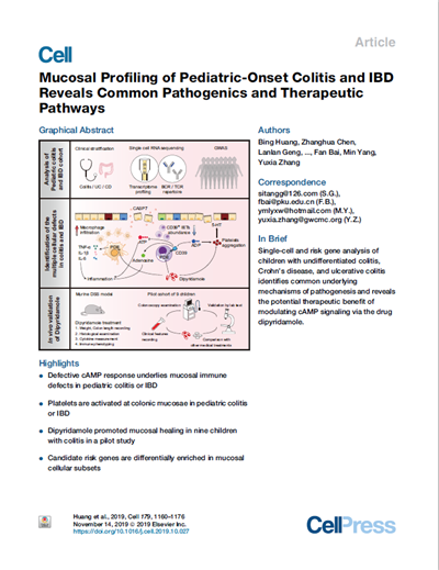 儿童慢性结肠炎和炎症性肠病(PIBD)的发病率近年来迅猛提高。该病存在多个临床亚型,其中溃疡性结肠炎(UC)和克罗恩氏病(CD)药物治疗无效率高。病情反复发作会严重影响儿童的身心发育,高额的治疗费用也给家庭和社会带来了巨大的经济负担,因此迫切需要一种新型的防治方法运用于临床,但仍不清晰的PIBD免疫致病机制是阻止这一需求的绊脚石。为此,合作团队利用深度免疫分型并结合单细胞转录组测序技术、全基因组关联分析、体外、动物和临床实验,对儿童非疾病对照、慢性结肠炎、UC和CD的肠粘膜主要的免疫/非免疫细胞的表型和功能进行了分析,最终发现胞内第二信使环状单磷酸腺苷(cAMP)的缺乏会导致免疫微环境发生紊乱,从而促进儿童结肠炎或IBD的发生发展,主要表现为肠粘膜富集大量的磷酸二酯酶4B(PDE4B)和肿瘤坏死因子α(TNFα)高表达的巨噬细胞,CD39在结肠上皮T淋巴细胞中发生下调,以及血小板的聚集和活化,并释放血清素(5-HT)。为此,合作团队利用靶向PDE的临床药物双嘧达莫(也称潘生丁)在动物实验和初步临床实验中证实可以恢复肠道的免疫稳态,有效治疗儿童结肠炎,并可能在儿童UC和CD的治疗中发挥作用。第二信使激动剂的进一步开发和临床应用,将为儿童和成人胃肠道炎症性疾病的治疗开拓新的领域,并能够节约大量医疗成本。