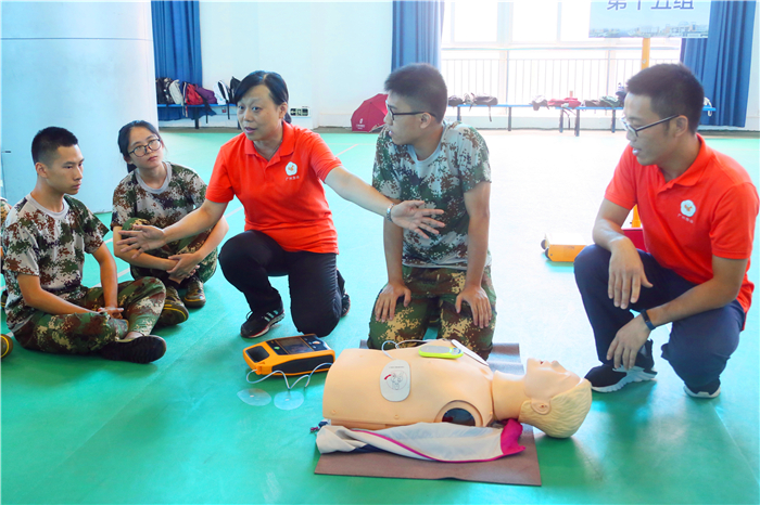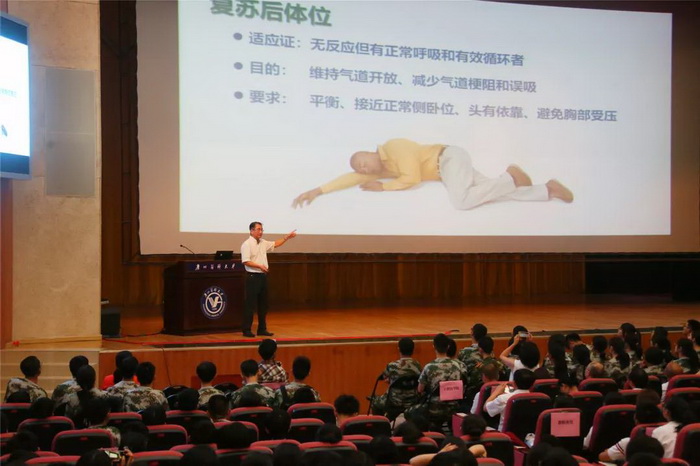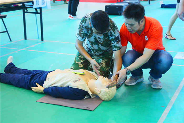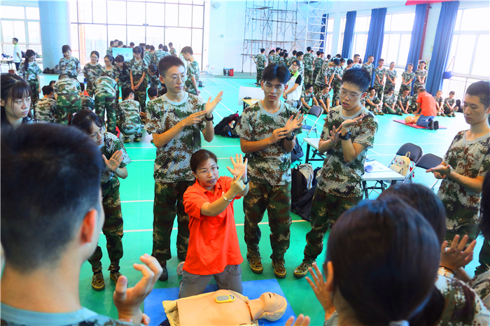 在实践操作环节,急诊医学教研室从第一、第二和第三临床学院急诊科安排50名优秀的医务工作人员,组建了专业的培训团队。2100多名新生分成50组107场次,每组配模型2个、教师1名,重点围绕胸外心脏按压、开放气道、人工通气、早期除颤等内容,培训老师先作示范,学生逐一进行反复训练,老师手把手指导急救技能。培训之后进入考核环节,确保每位学生都能熟练掌握心肺复苏等急救技能。
