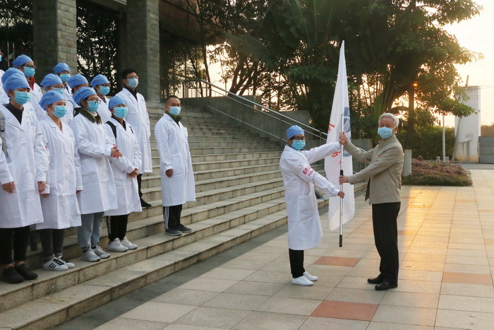 党委书记冉丕鑫向学生志愿服务队授旗并与志愿者握手,特别叮嘱随队驻场医师密切关注,在完成任务的同时确保同学们的安全。