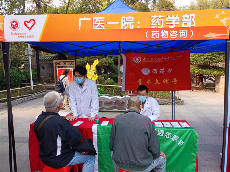 3月3日下午,广医一院南山志愿服务队组织呼吸内科、心内科、老年科、泌尿外科、骨科、儿科、眼科、中医科、药学部、检验科等青年文明号集体来到广州市越秀区五仙观广场,为群众们开展了一场义诊活动。