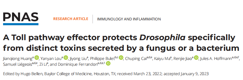 近日,开云kaiyun官方网站霍夫曼免疫研究所Dominique Ferrandon-李孜教授课题组等联合在《Proc Natl Acad Sci U S A》杂志在线发表了题为“A Toll pathway effector protects Drosophila specifically from distinct toxins secreted by a fungus or a bacterium”的研究论文,该研究发现了Toll通路调控的效应分子Bara A不是通过直接抵抗粪肠球菌以及罗伯茨绿僵菌的感染,而是保护宿主免受其分别分泌的毒素-EnterocinV、DestruxinA的毒害作用。