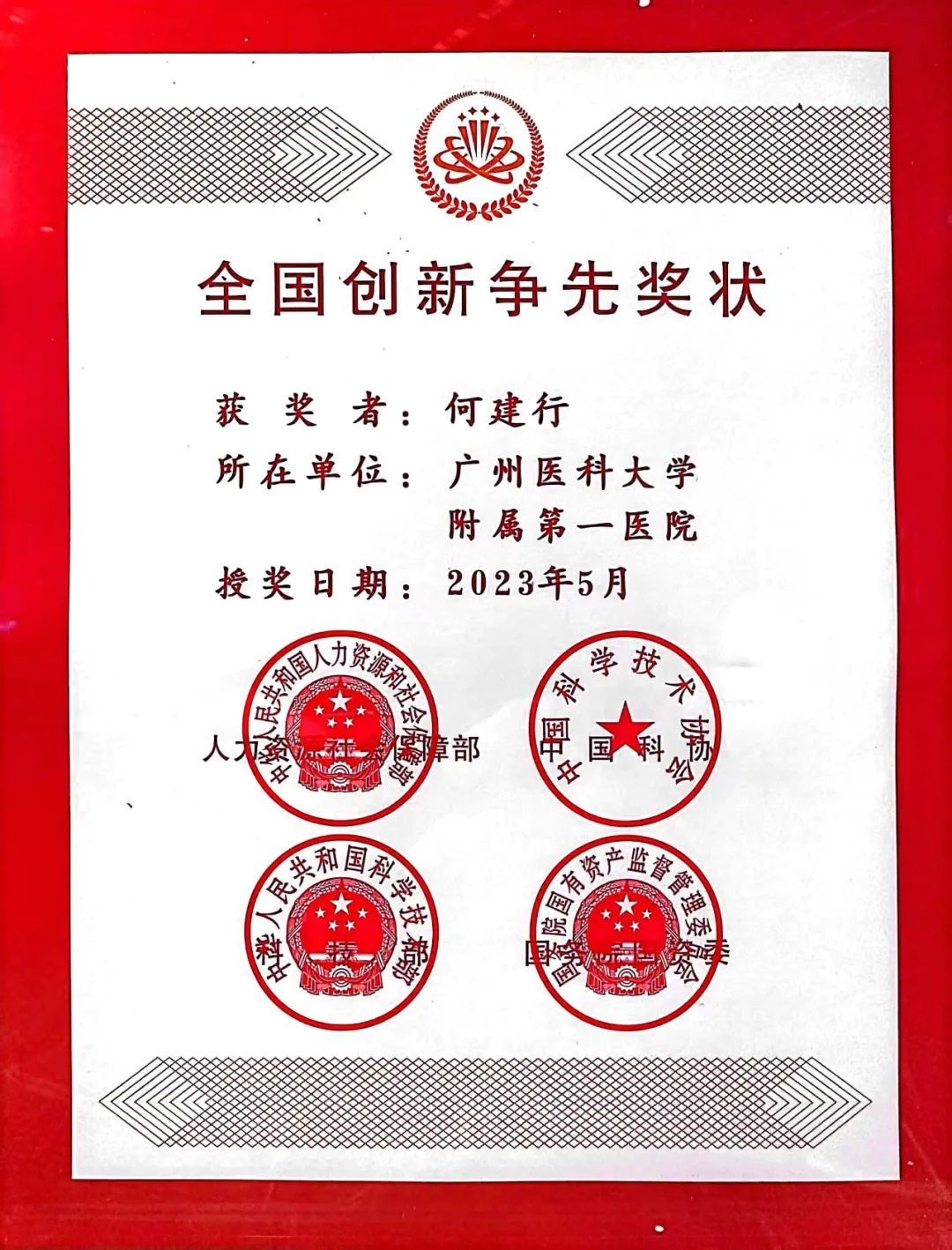 开云官网附属第一医院国家呼吸医学中心主任、广州呼吸健康研究院院长、胸外科学科带头人何建行教授获第三届全国创新争先奖状。