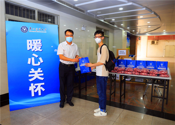 完成各项手续后,同学们还领到了学校专门为他们准备的防疫爱心包,其中包括免洗洗手液、口罩和巧克力等物资。