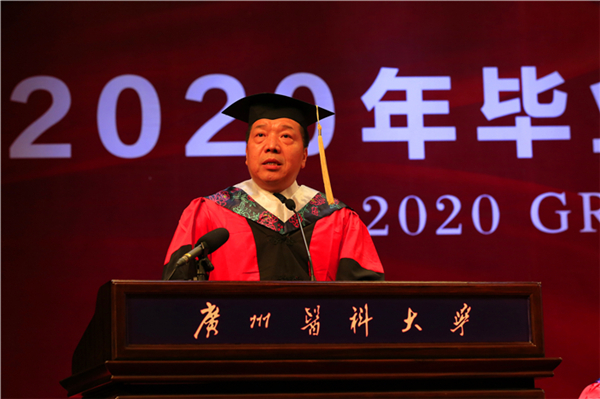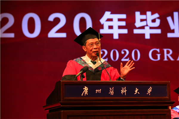 钟南山院士来到毕业典礼现场,担任国家卫健委高级别专家组组长的他分享了5个多月抗疫的深刻感悟,作为对2020届毕业生的临别赠言:第一是中国战“疫”充分体现出制度的优越性。面对突如其来的新冠肺炎疫情,党和国家把人民生命安全和身体健康放在第一位,并取得实际的防控成果。同学们毕业后也许会遇到各种各样的考验,但中国制度的优越性为我们提供稳步向上的发展空间,我们要充满信心去迎接挑战。第二是国家崇尚科学、尊重科学。国家制定抗疫措施遵从科学规律,充分吸收了专家的意见。全国科技工作者为疫情防控斗争提供了科技支撑,其中,广医也在科研攻关上取得多项进展。希望同学们在今后的工作中学会不满足于现状,不断探索创新,推动医学等各方面事业的发展。第三是在生死考验的关头,医者的良心是最重要的。从17年前抗击非典的坚持实事求是,到今年援鄂医务人员的勇敢逆行、舍生忘死,充分体现了中国医务人员的可贵品质,同学们也要坚持和发扬这一本色。