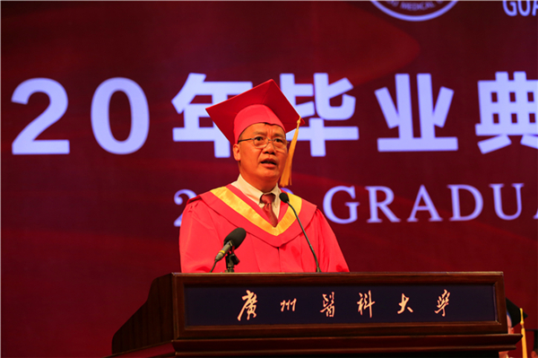 校长王新华在热情洋溢的讲话中向毕业生致以最热烈的祝贺和最衷心的祝福,向老师们、家长们致以最崇高的敬意和最诚挚的感谢。“因为你们将最宝贵的青春年华留在了广医,让广医散发着永恒的青春光彩;因为我们曾一起携手前行,共同参与见证广医的奋斗历程;因为你们对学校的理解和包容,支持和热爱,让广医变得更加美好和温暖。”他以“感谢”“感动”“感激”为关键词,表达了对毕业生们的真挚情感。