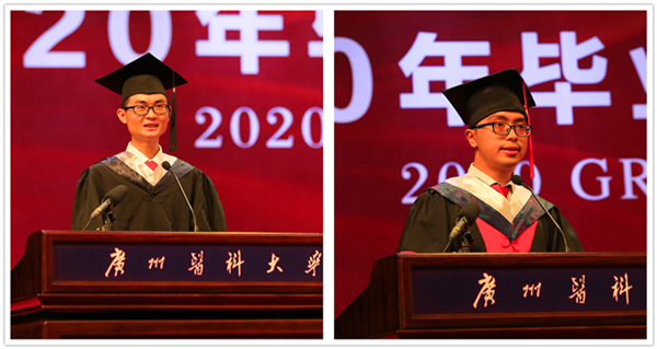 生物技术专业彭浩同学和博士生陈贲同学分别代表毕业本科生、研究生发言。他们分享了在广医学习生活的感悟与收获,并代表毕业生向师长的培养之恩表达最衷心的敬意与感谢。彭浩说,在广医的学习时光让他坚定拥抱从事科学研究的梦想,“让我们用奋斗书写青春,带着广医人精神,扬帆起航!”陈贲说,广医人在抗疫中以实际行动付出了努力,让同学们感到非常自豪,“我们将穿上白色战袍,竭尽全力地用‘微光’去照亮周围,助健康之完美”。