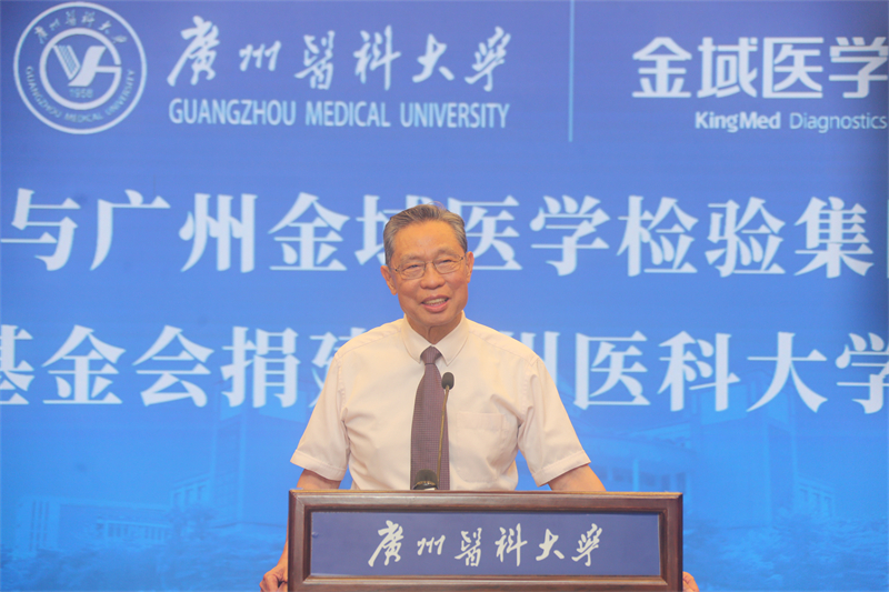 钟南山院士在讲话中表示, 党的二十大报告提出,必须坚持“创新是第一动力”,要坚持创新在我国现代化建设全局中的核心地位。建设“双一流”大学,关键在于教育体制和教学模式的创新。广医和金域医学共建金域检验学院,以企业为主办学,培养出的学生能很快用得上、接地气,探索国内高校人才培养的新路径。因此,广医的“双一流”建设,要在理念上有所创新。金域医学经过近30年的发展,进步非常快,为国家公共卫生事业的发展贡献了重要力量,第三方医学检验行业一定会有更好的发展。下一步,双方要考虑如何进一步开展合作,结合双方优势,在教学、人才培养方面,不断创新模式,培养未来医检行业的骨干人才,为我国高水平教育贡献力量。