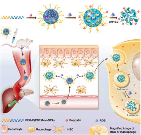近年来,朱康顺教授团队围绕着肝纤维化-肝硬化-肝癌开展了一系列开拓性的研究,在以往的成果基础上,本研究以肝纤维化发生密切相关的肝星状细胞、肝脏巨噬细胞、肝实质细胞为靶点,应用纳米靶向治疗的方法,同时利用纳米载体的活性氧及pH双重敏感性响应肝脏微环境,实现药物在肝内的定点、集中释放,借助中药单体虎杖甙的抗炎、抗氧化作用,达到了治疗肝纤维化的目的。