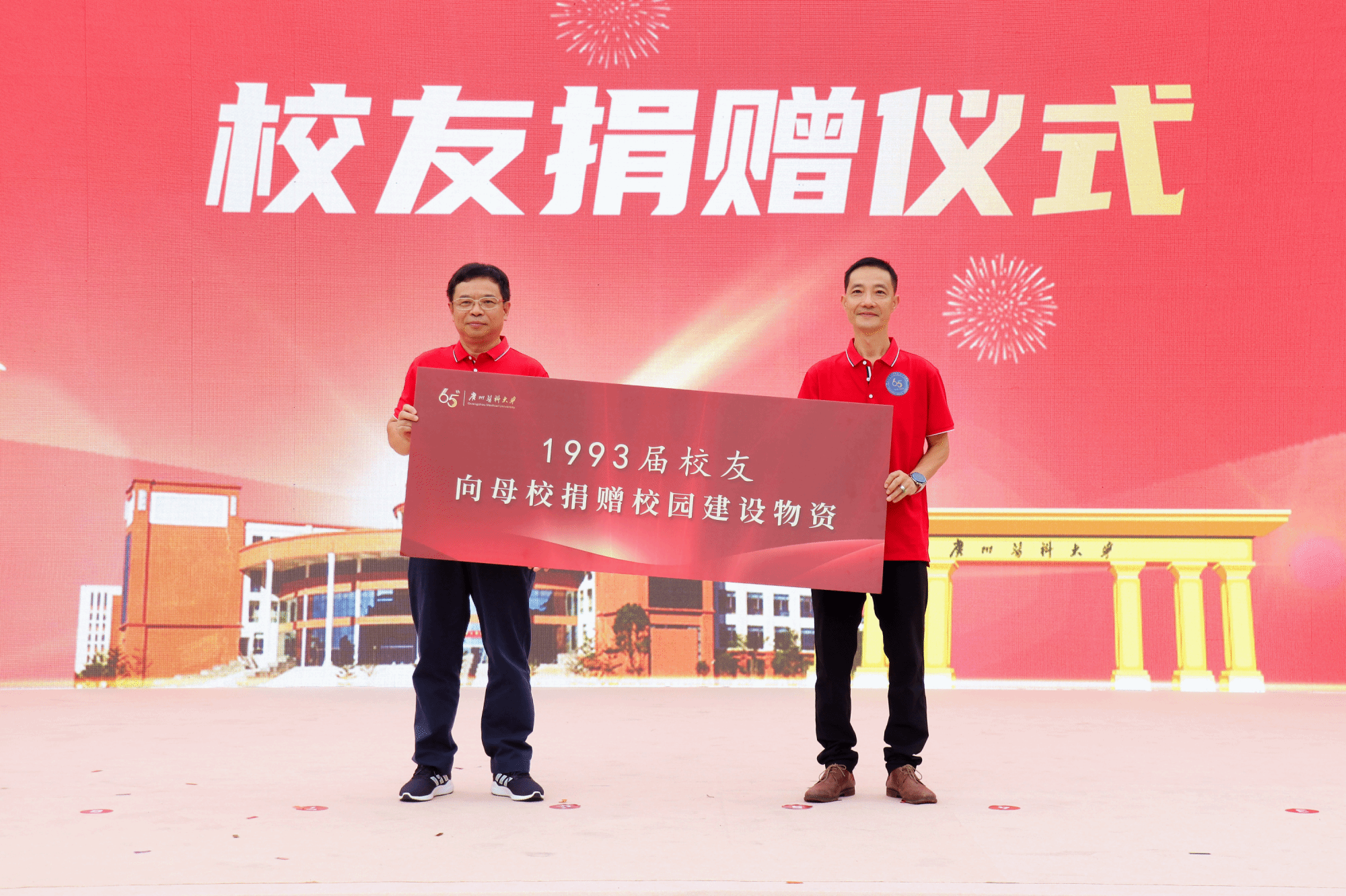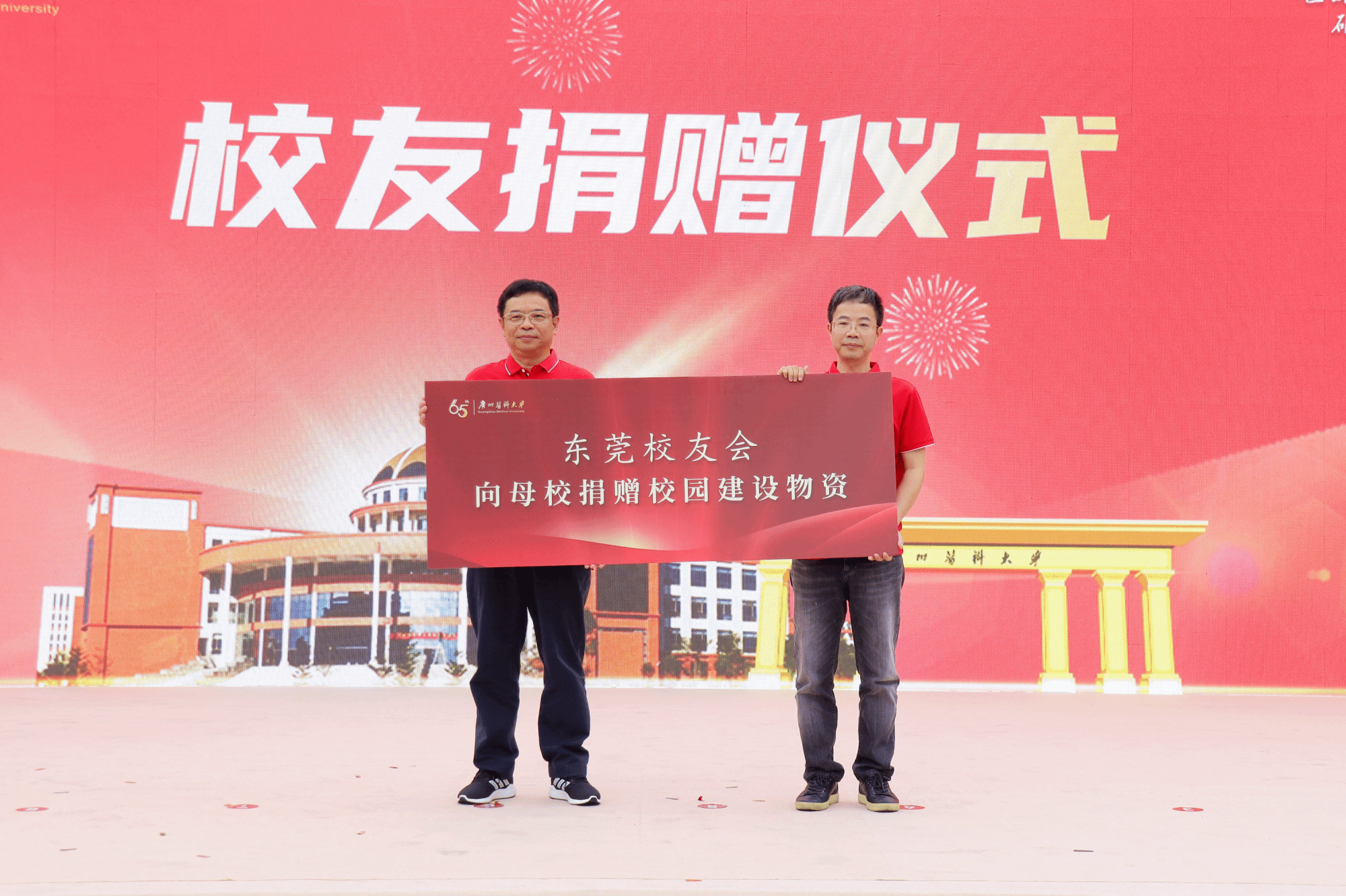 东莞校友会、1993届校友、2003届校友分别向母校捐赠校园建设物资,以实际行动助力母校校园环境建设。唐小平书记代表学校接受捐赠,并向校友代表赠送纪念品。