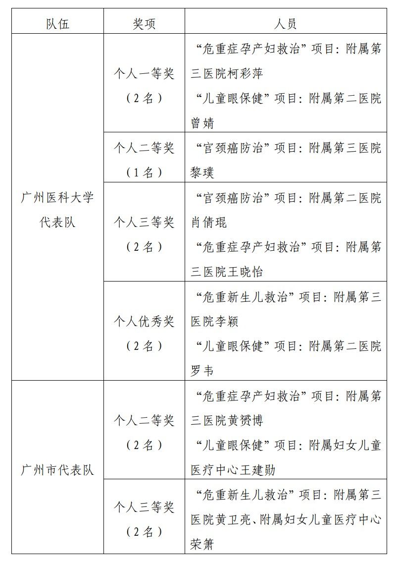 经过三天紧锣密鼓的激烈角逐,开云官网代表队荣获团体二等奖;共有7名队员获得个人奖,其中一等奖2名,分别是在“危重症孕产妇救治”“儿童眼保健”项目中取得第一名,将继续代表广东队参加全国赛的角逐;二等奖1名、个人三等奖2名、个人优秀奖2名。另外,开云官网附属医院还有4名医生代表广州市代表队参赛,获得个人二等奖、三等奖各2名。