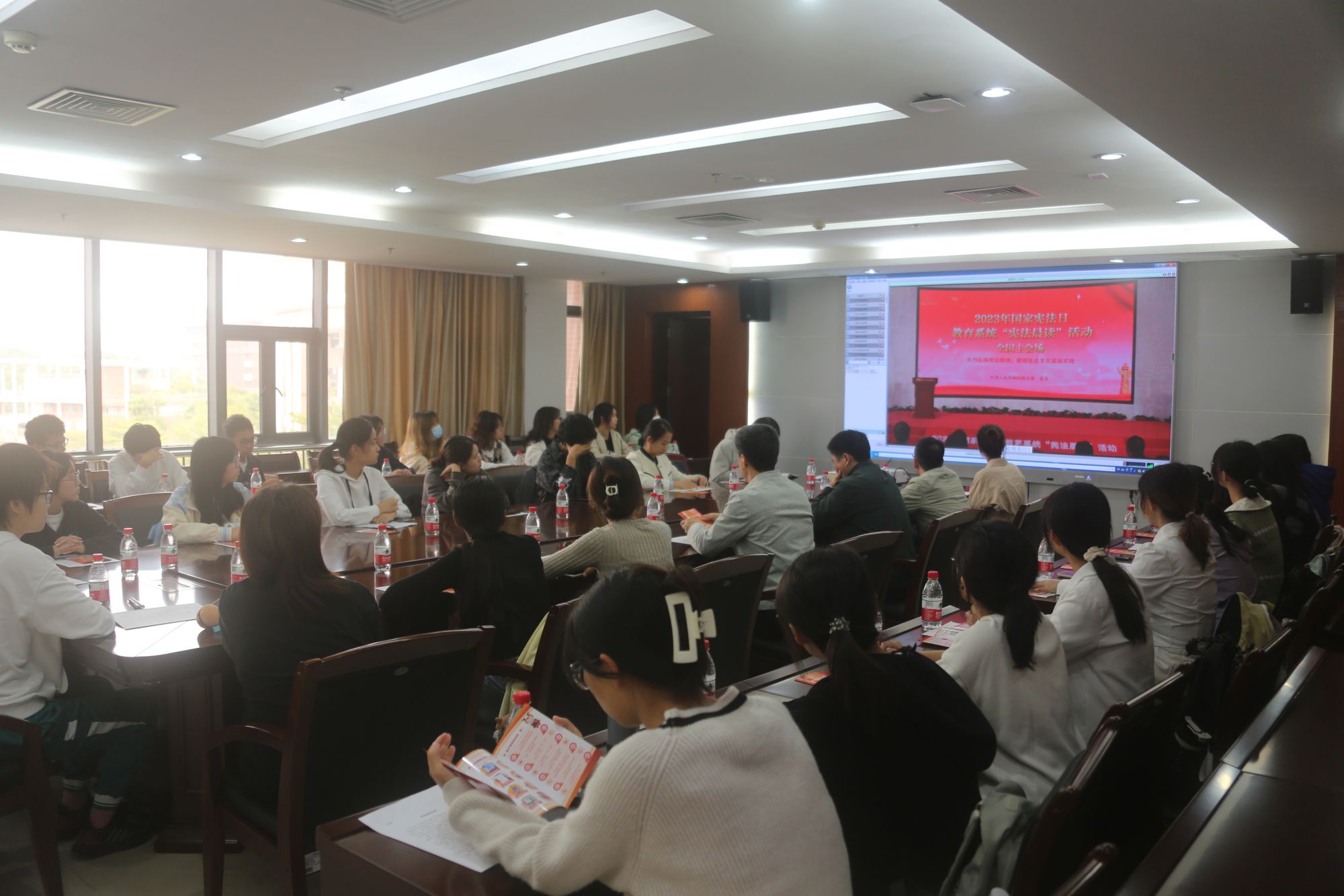 今天是第十个国家宪法日。为深入学习贯彻党的二十大精神,贯彻落实习近平法治思想和习近平总书记关于宪法法治教育的重要指示精神,引导广大青年强化宪法意识,弘扬宪法精神,12月4日上午,开云官网组织师生代表在番禺校区举行“宪法晨读”活动。部分职能部门负责人、教师代表、学生代表现场参与活动。在晨读环节中,师生代表跟随北京主会场共同朗读了《中华人民共和国宪法》中的部分章节,并聆听教育部领导讲话、观看第八届全国学生“学宪法 讲宪法”演讲比赛获奖选手展演。为进一步增强师生国家安全意识和保密意识,活动现场还同步开展了《中华人民共和国国家安全法》《中华人民共和国保守国家秘密法》等法律的学习宣传活动。