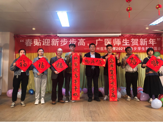 2月11日除夕之夜,赵醒村副校长、学生工作处负责人以及辅导员老师与留校学生共度除夕,共吃年夜饭。写挥春、贴年红、吃饺子、看春晚……广医除夕之夜年味十足,节目丰富。同学们纷纷表示,这是他们度过的最特别、最难忘的除夕之夜。