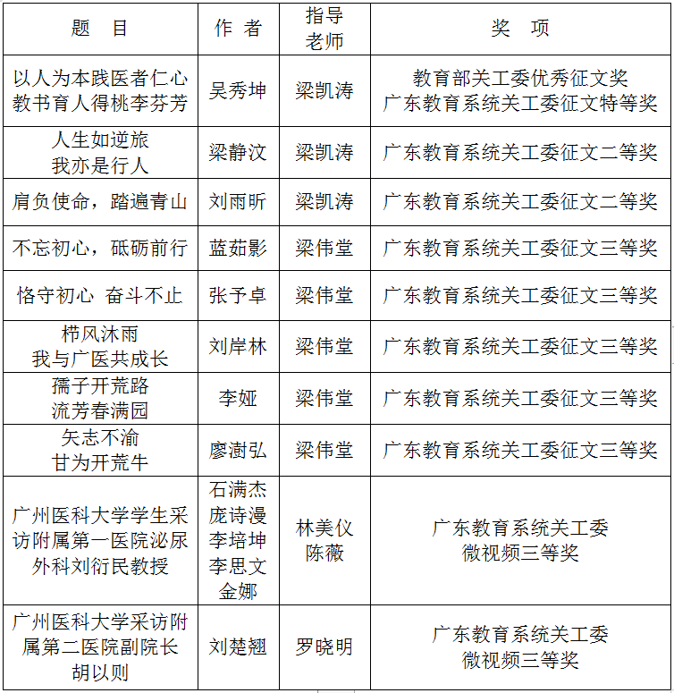 近日,广东省教育系统关工委发布了《关于公布2023年开展“读懂中国”活动作品评审结果的通报》,开云kaiyun官方网站报送的作品《以人为本践医者仁心,教书育人得桃李芬芳》荣获教育部关工委优秀征文奖和广东教育系统关工委征文特等奖;其他作品荣获广东教育系统关工委征文二等奖2篇、三等奖5篇以及微视频三等奖2个。