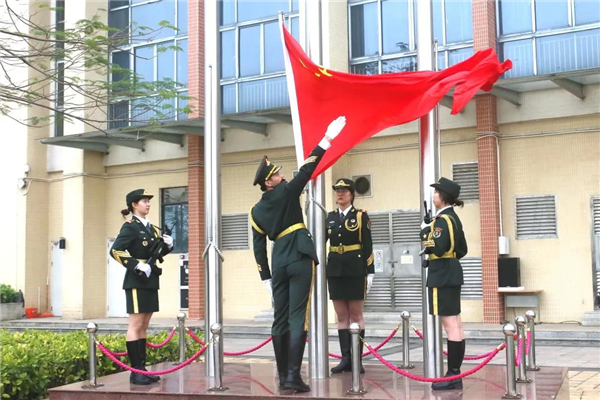 步履铿锵的升旗手、护旗手护送鲜艳的五星红旗进场。“升国旗、奏唱国歌!”雄浑激昂的《义勇军进行曲》响起,升旗手振臂一挥,五星红旗迎风展开、徐徐升起。全体师生一起高唱国歌,并向国旗行注目礼,深怀对祖国无限的热爱和崇高的敬意。