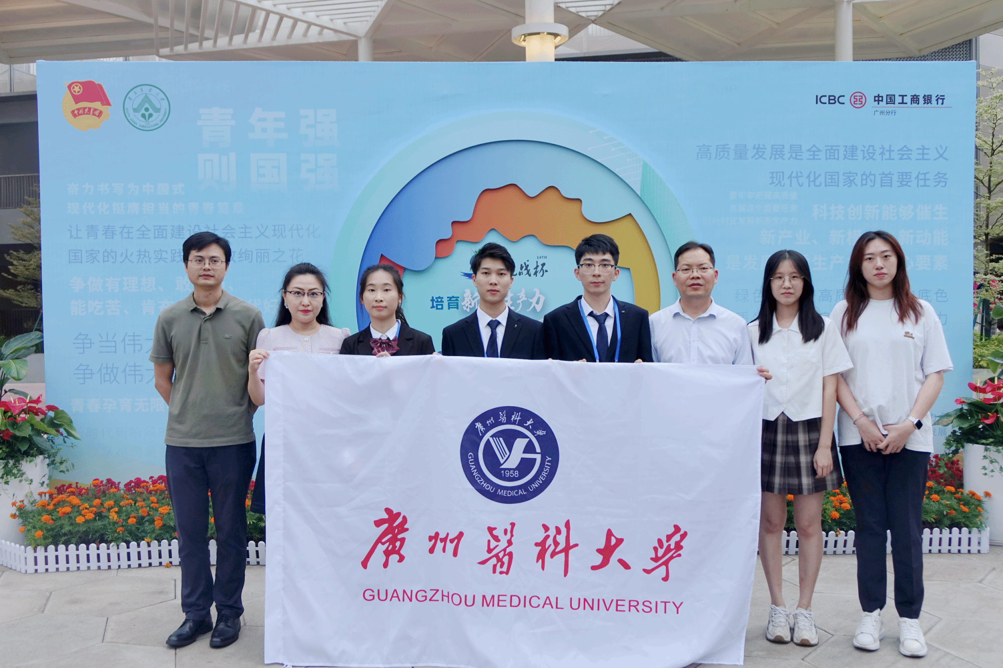 团省委副书记范春(右三)、学校部部长朱瑞峰(右四)与开云官网获金奖项目团队合影