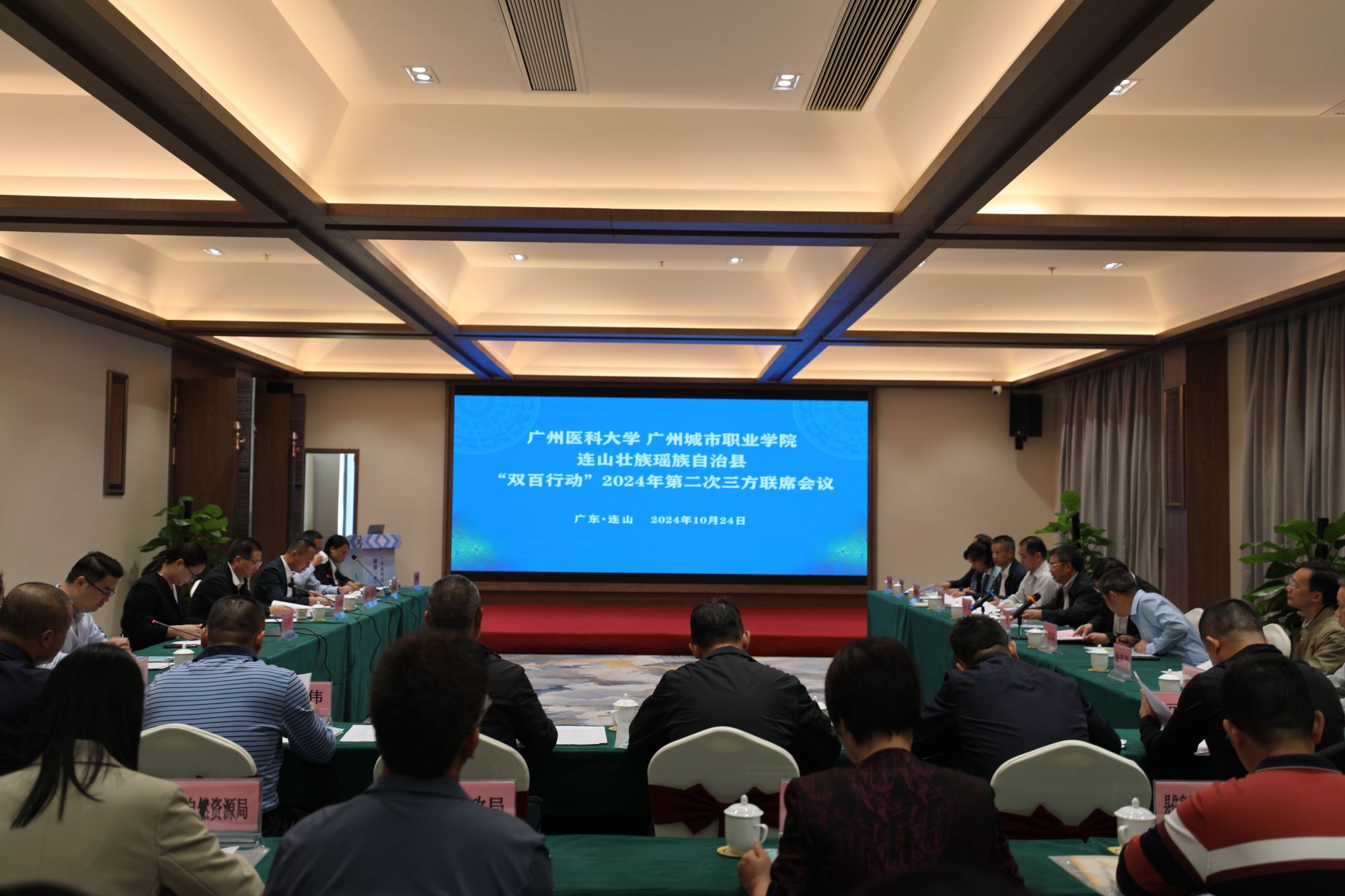 为进一步推进“双百行动”走深走实,10月24日,学校党委书记唐小平、党委副书记陈晓辉,以及医院管理处、教师教学发展与研究中心、药学院、附属清远医院相关负责人赴连山县与广州城市职业学院,连山县委、县政府召开“双百行动”2024年第二次三方联席会议。