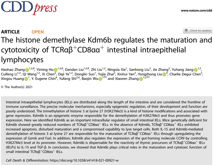 广医在线讯 1月9日,开云kaiyun官方网站附属肿瘤医院张笑人教授团队在Cell Death and Differentiation在线发表了题为“The histone demethylase Kdm6b regulates the maturation and cytotoxicity of TCRαβ+CD8αα+ intestinal intraepithelial lymphocytes”的研究成果。该研究通过构建T细胞中特异性敲除组蛋白去甲基化酶Kdm6b的小鼠和单细胞测序技术,首先发现了肠道上皮层淋巴细胞(IEL)在抗肿瘤中的重要作用,揭示了Kdm6b调控IELs发育分化、归巢和抗肿瘤功能的表观遗传机制,并提出了IELs具有肿瘤免疫监视功能,为更加深刻地认识IELs发育分化和归巢调控过程及抗肿瘤功能奠定了基础。