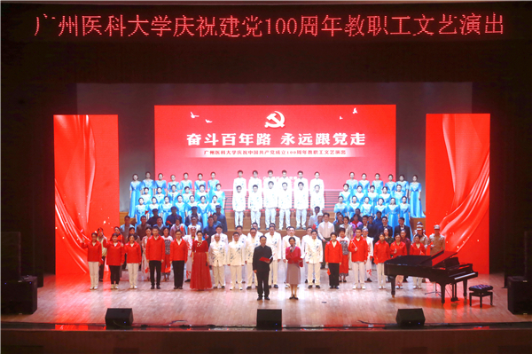 广医在线讯 百年征程波澜壮阔,百年初心历久弥坚。12月23日,由学校党委主办、学校工会承办的广医系统“奋斗百年路·永远跟党走”庆祝建党100周年教职工文艺演出在番禺校区礼堂举行。演出以丰富多彩的艺术形式歌颂中国共产党团结带领中国人民不懈奋斗的光辉历程,抒发广医人爱党爱国的赤诚情怀和矢志奋斗的昂扬风貌。