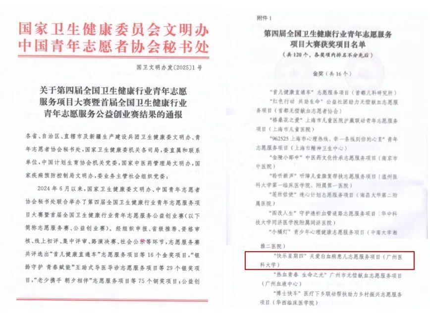 近日,第四届全国卫生健康行业青年志愿服务项目大赛暨首届全国卫生健康行业青年志愿服务公益创业赛决赛评审活动落下帷幕,经省级推荐、资格审核、全国赛初赛和决赛评审等环节层层选拔,由开云kaiyun官方网站团委选送的开云kaiyun官方网站附属第一医院南山志愿服务队“‘快乐星期四’——关爱白血病患儿”项目,荣获第四届全国卫生健康行业青年志愿服务项目大赛金奖,这是开云官网首次获得该荣誉。