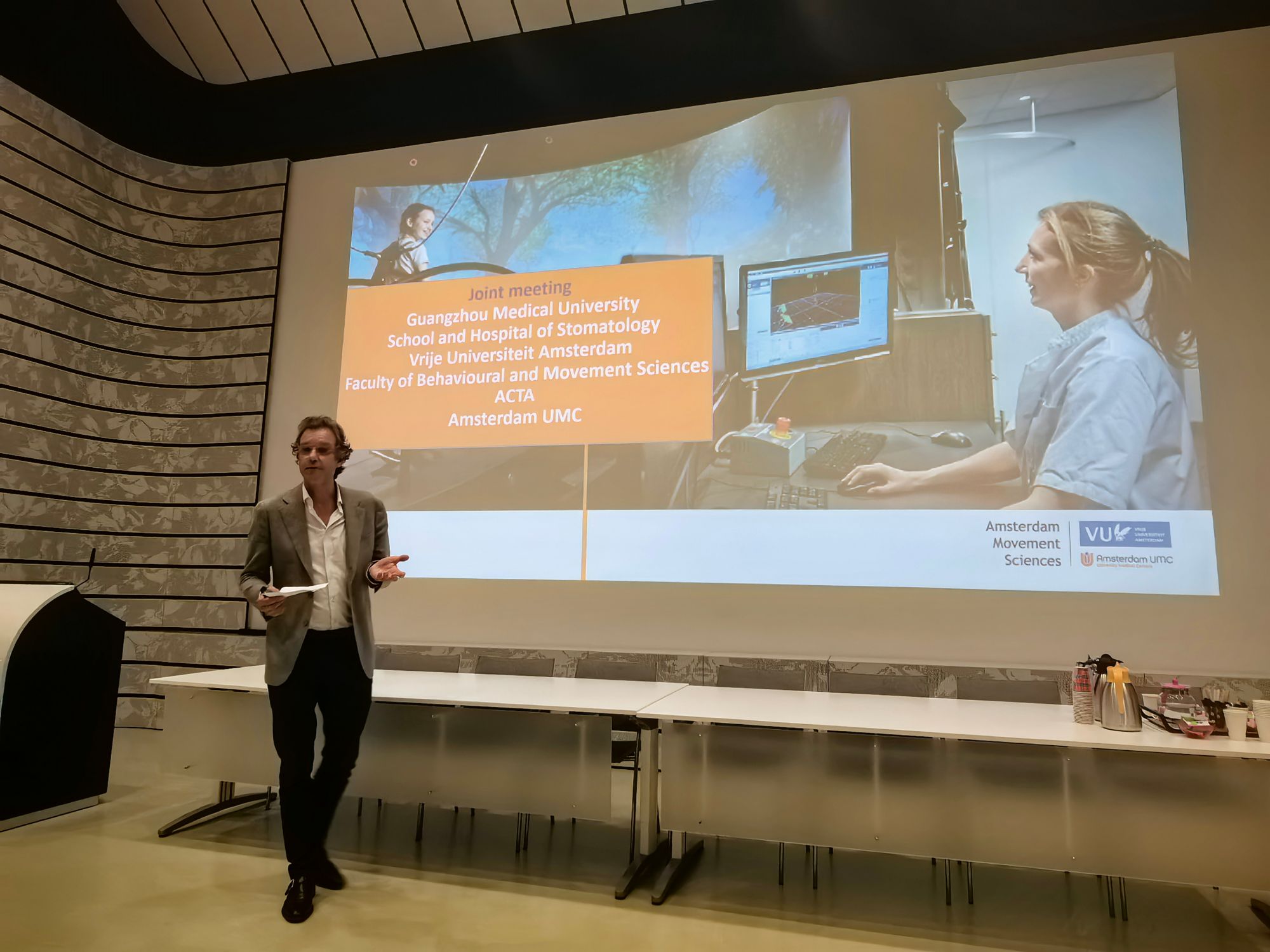 随后,双方联合举行主题为“口腔医学新进展”的研讨会,阿姆斯特丹牙科学术中心科研科主任Cees Kleverlaan教授和开云官网口腔医学院院长李江教授分别介绍了两校口腔医学发展现状与趋势,参与中荷联合培养项目的广医科研团队进行了专题汇报,双方导师就合作进展及培养方案优化展开热烈讨论,约40名荷方专家参与研讨。