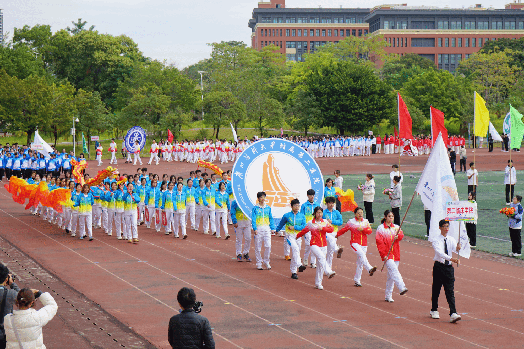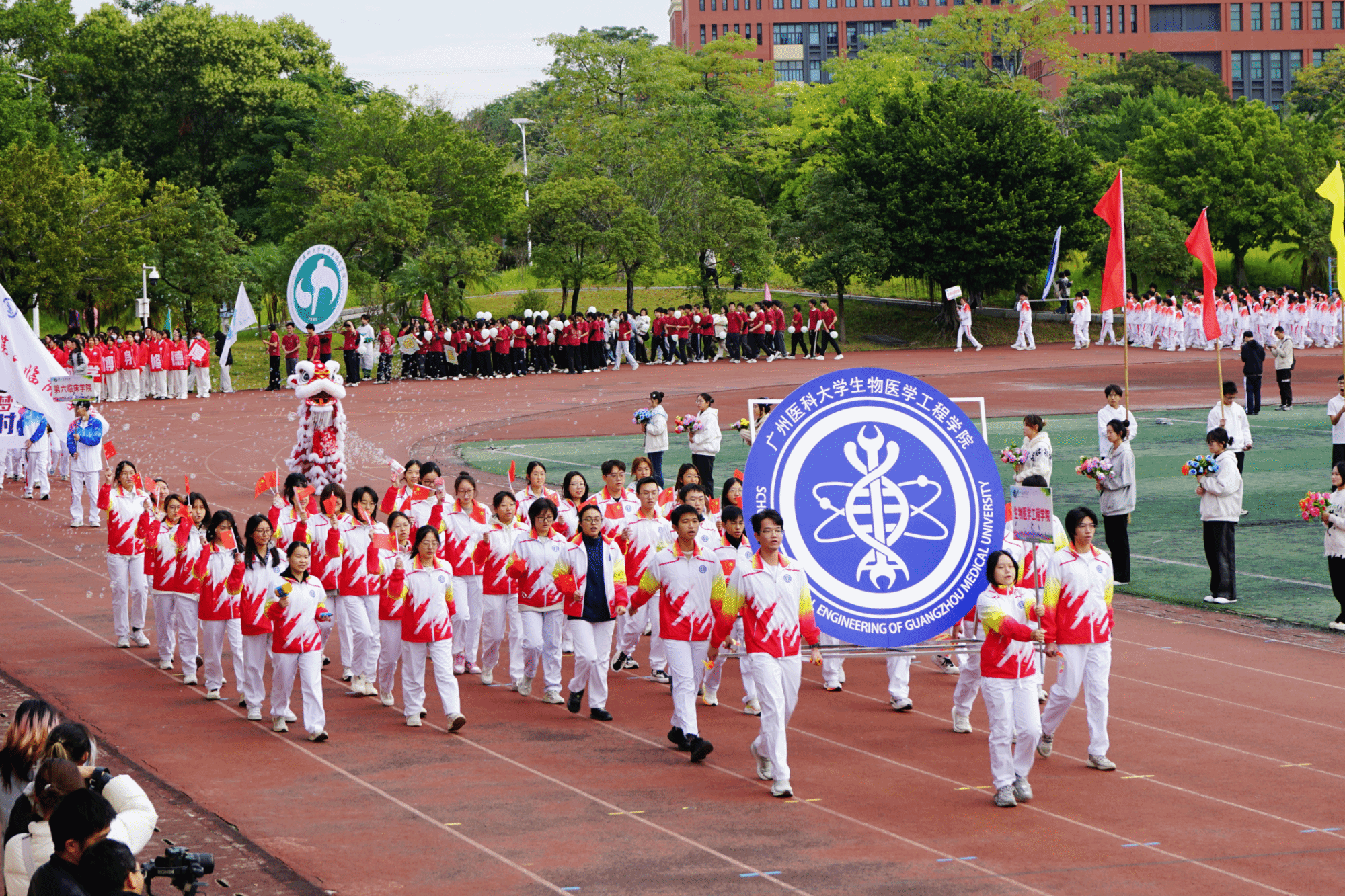 开幕式现场,国旗队、校旗队、彩旗队、鲜花队、裁判员代表队以及各学院运动方阵,昂首阔步踏入会场。各方阵整齐的步伐、嘹亮的口号,展现广医学子阳光向上、奋勇拼搏的青春姿态。