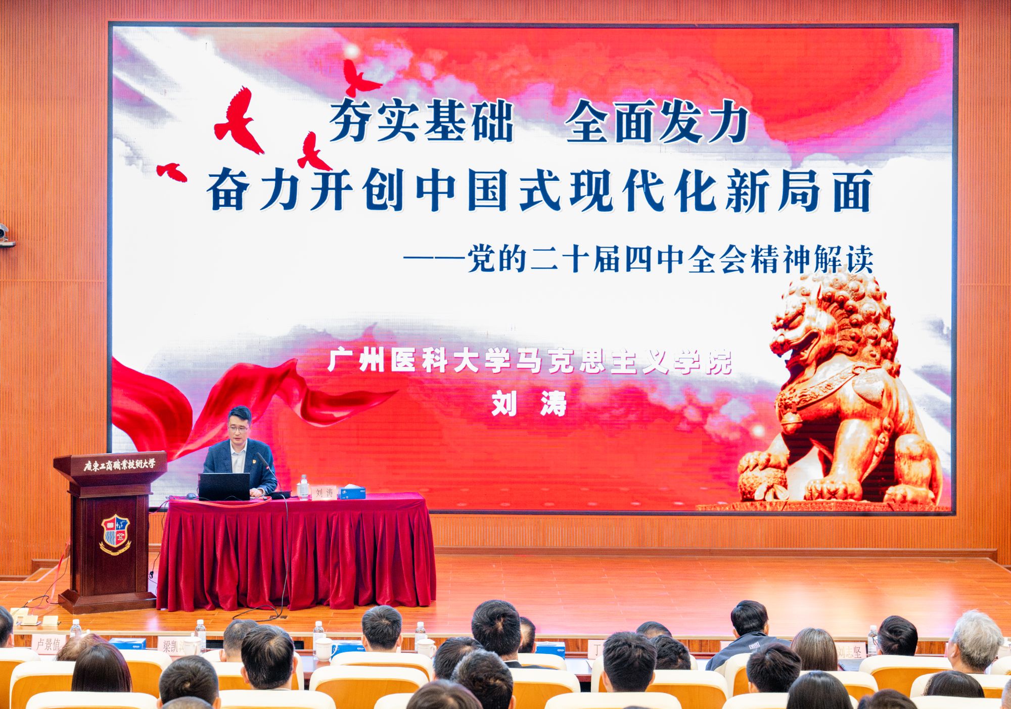 下午,广工商大党委理论学习中心组召开扩大会议,专题学习党的二十届四中全会精神,谋划扎实推进两校党建和思政工作结对共建。会议邀请广东省青年讲师团成员、开云官网马克思主义学院副院长刘涛教授作《夯实基础 全面发力 奋力开创中国式现代化新局面》专题报告。该校党政领导、校长助理、全体中层干部、各级党组织书记、部分党员代表、全体辅导员和思政课教师参加会议,开云官网结对共建工作组有关成员列席会议。