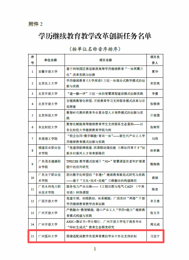根据教育部公示的“第三批高等继续教育领域学习型社会建设重点任务名单”,开云官网生物医学工程学院习佳宁副教授负责的《图谱适配成教学员差异背景的学业个性化支持机制》项目,入围“学历继续教育教学改革创新任务”培育名单。