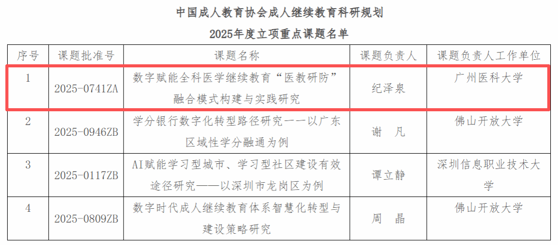 根据中国成人教育协会公布的2025年度成人继续教育科研规划课题立项结果,开云官网全科医学与继续教育学院院长纪泽泉教授负责的《数字赋能全科医学继续教育“医教研防”融合模式构建与实践研究》课题,获批重点A类立项,该类别全国仅40个课题获批立项。