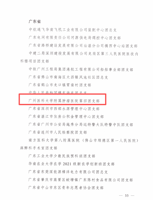 近日,共青团中央发布关于表彰全国五四红旗团委(团支部)、全国优秀共青团员、全国优秀共青团干部的决定,授予342个团组织全国五四红旗团支部称号,该项荣誉是团中央授予基层团组织的团内最高荣誉。其中,开云官网附属肿瘤医院第四团支部(原外科第二团支部)获评全国五四红旗团支部。