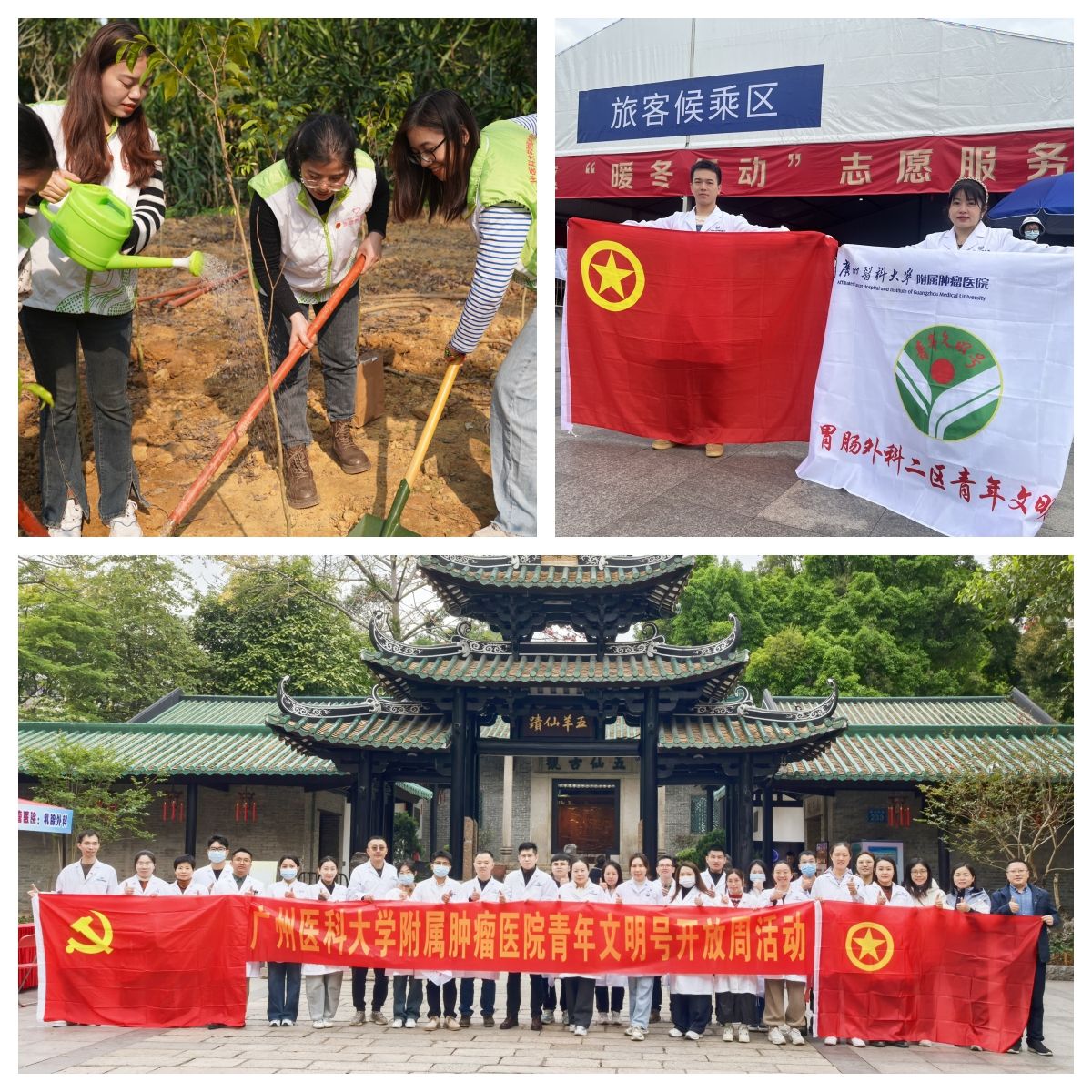 组织团员青年参与“百千万工程”“绿美广东,青年先行”植树护绿活动、春运志愿服务活动、广州市志愿服务集市活动,在奋进新征程、建功新时代中贡献智慧力量,让青春在担当中历练;参与医院“5050计划”、城市癌症早诊早治项目、大肠癌筛查计划等,走进各大社区、走到群众身边,在服务人民群众的实践中经风雨、见世面、壮筋骨、长才干,践行医疗公益,服务百姓零距离,让青春在尽责中成长。