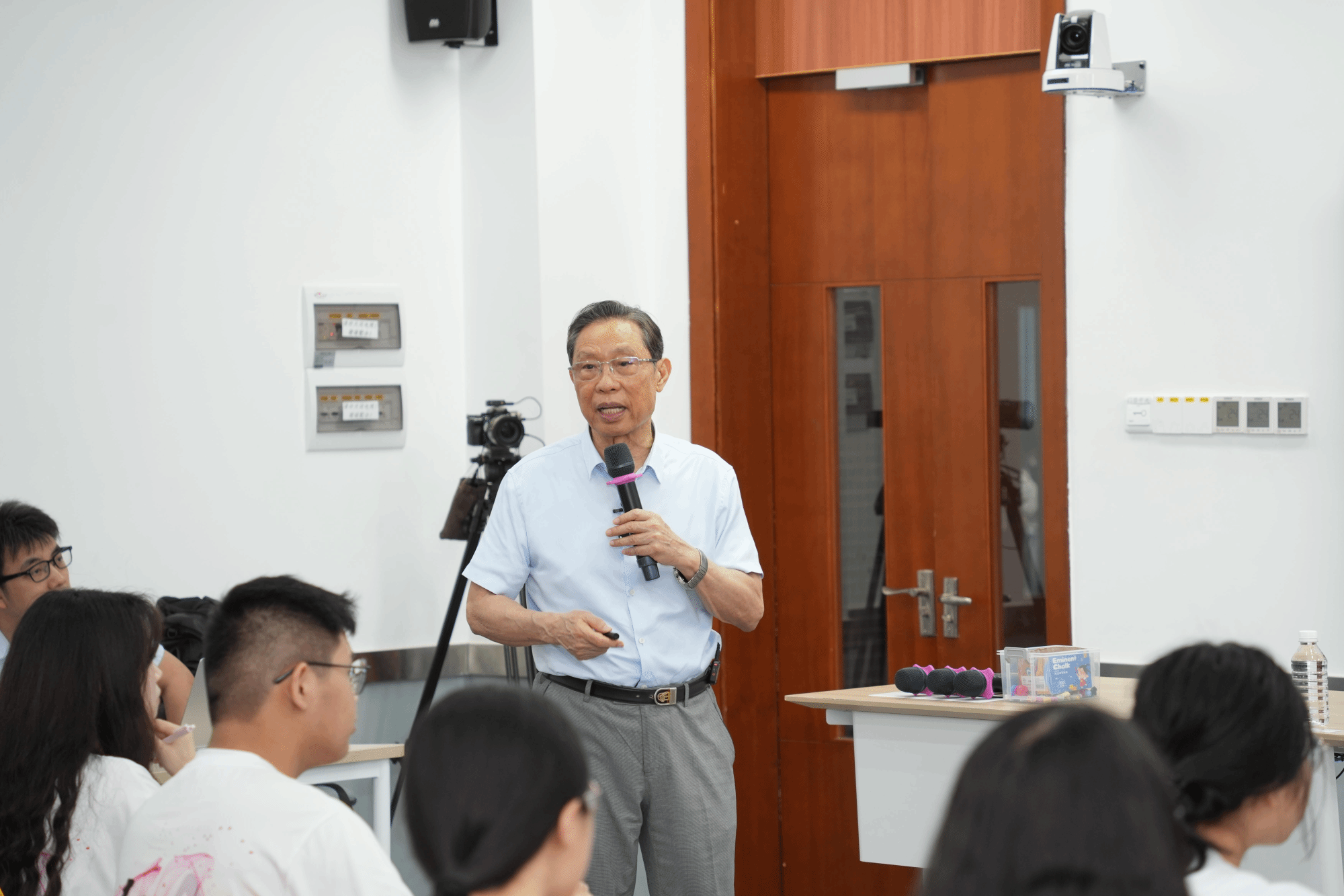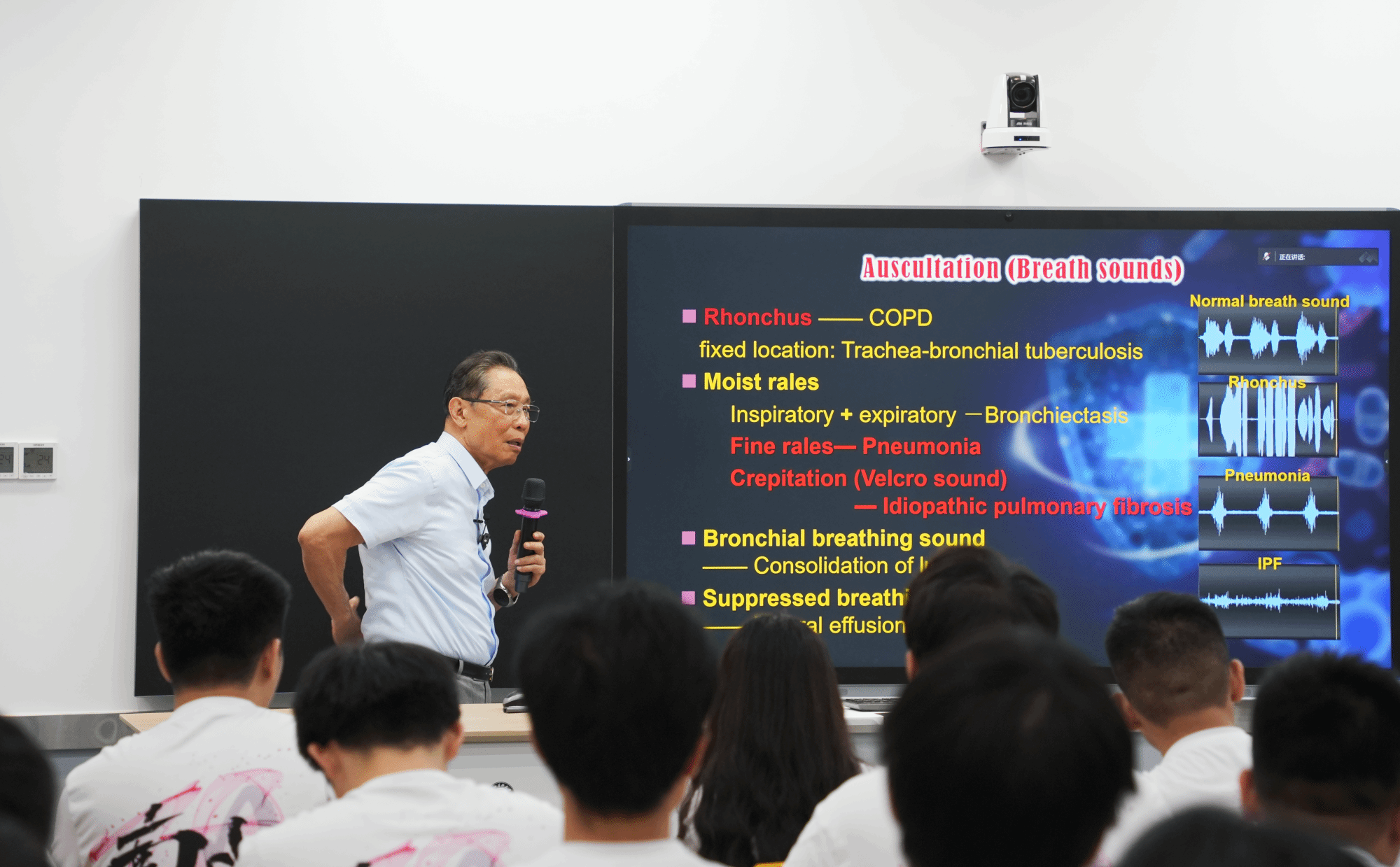 课上,钟南山院士介绍常见呼吸疾病患者的呼吸声音,用身体和手势进行示意讲解