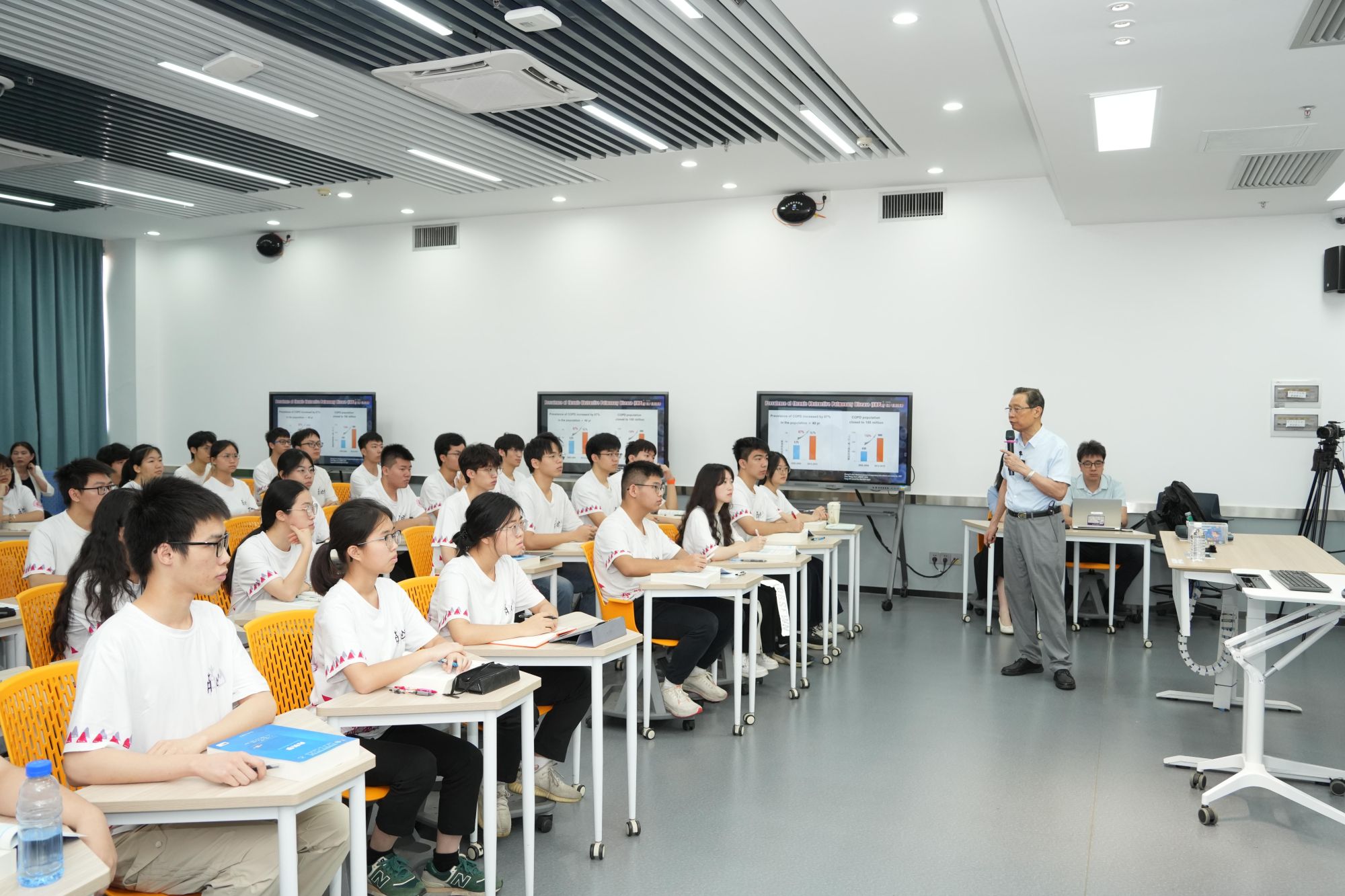 “从肺鼠疫、非典到新冠疫情等,本世纪的‘国际公共卫生紧急事件’,主要由呼吸系统传染病引起。”课堂上,钟南山结合丰富的临床和研究经验为同学们从总体上介绍了呼吸疾病的情况。他从新冠感染流行情况引入,围绕呼吸系统疾病患病情况、肺部结构及功能、呼吸疾病的危险因素及诊断等方面展开详细讲解。