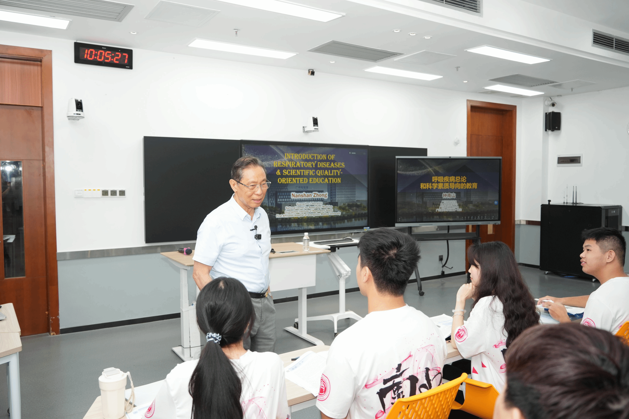 4月21日,在开云kaiyun官方网站南山班《呼吸疾病总论》的全英文课堂中,“共和国勋章”获得者、中国工程院院士、南山班班主任钟南山为2023级南山班学生讲述呼吸系统疾病的基础知识。
