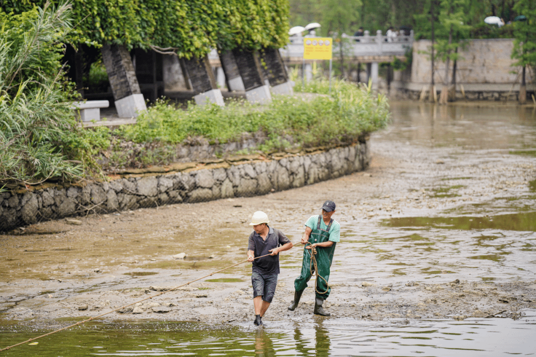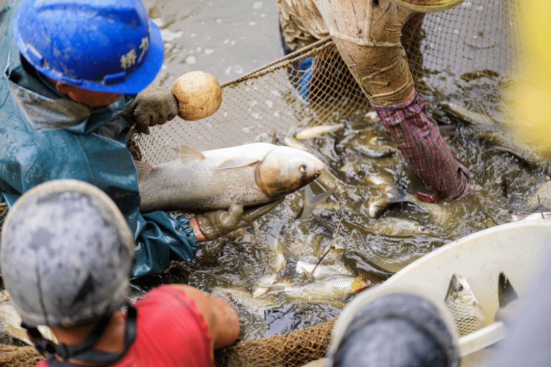 随着渔网逐渐收拢,水面上激起一朵朵白色浪花,一条条大鱼扑腾着拍打着水面,随后都被一股脑捞了起来。装桶、称重、上车一气呵成,大家纷纷上前拍照记录。