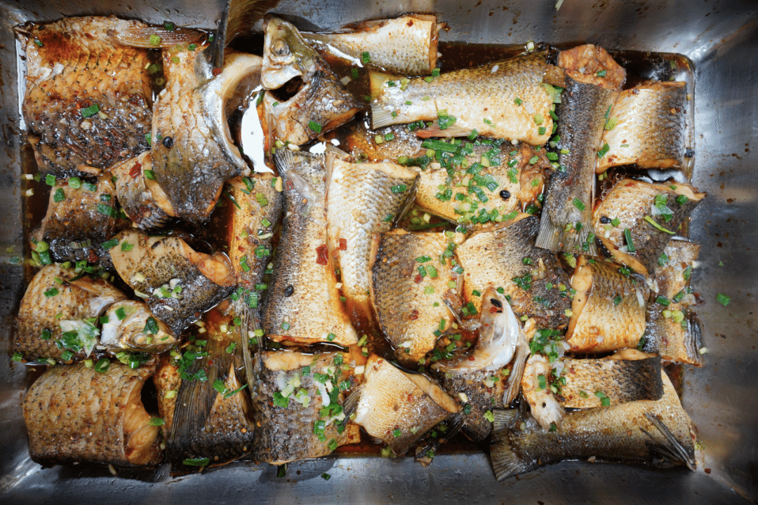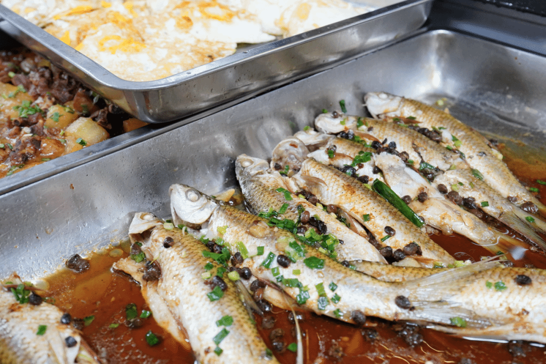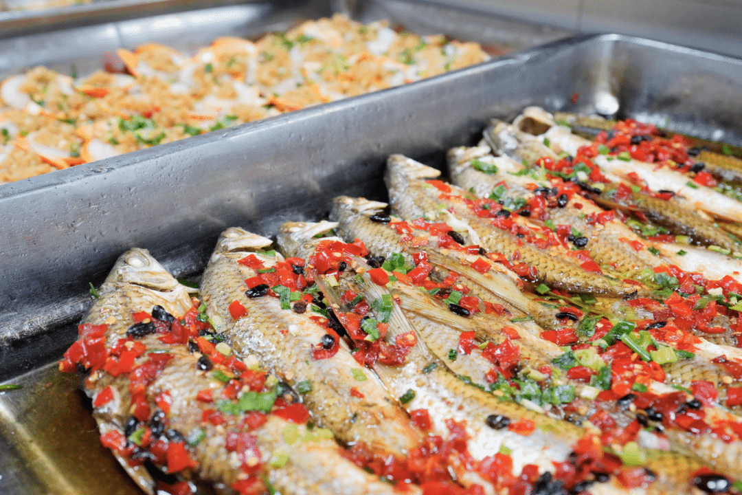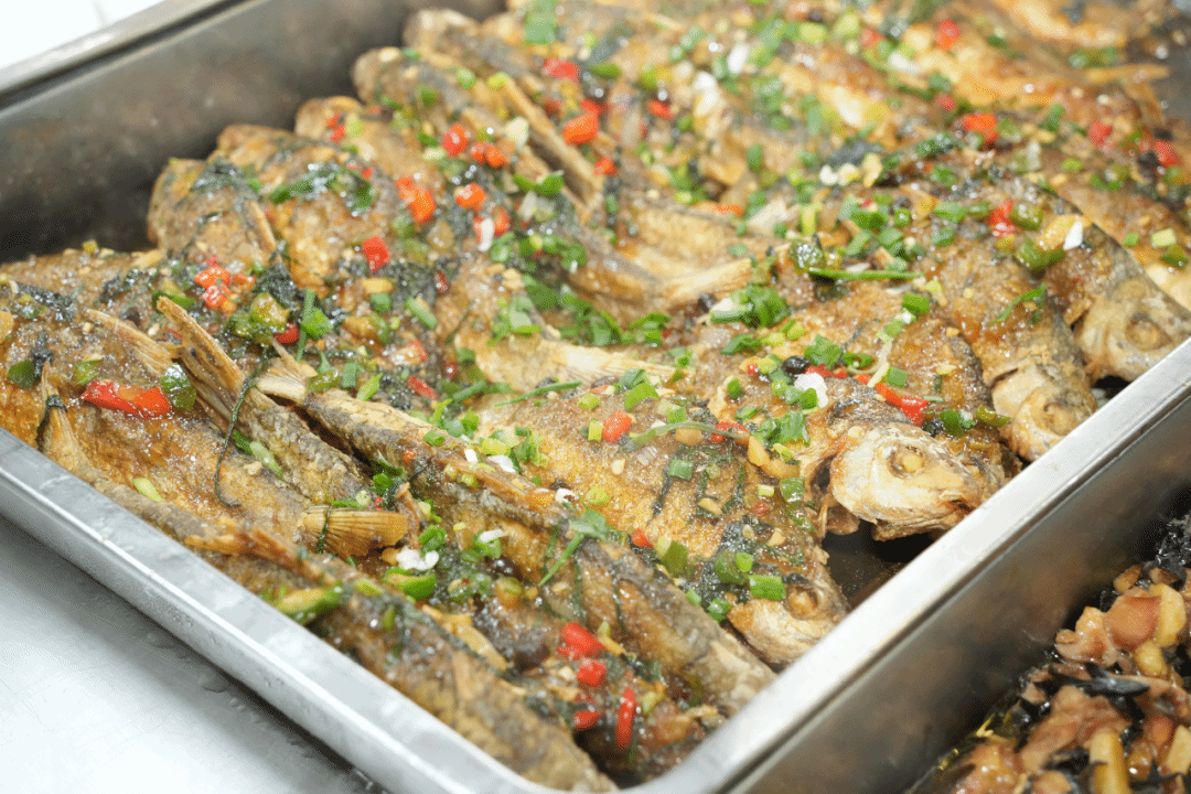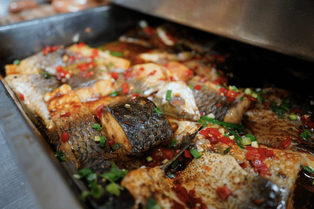 28号中午,隔着老远就闻到飘来的阵阵香气。剁椒鱼头、紫苏鱼、豉汁蒸鱼、酸甜鱼、香煎鱼、清蒸鱼,多种款式的美味出现在食堂里。