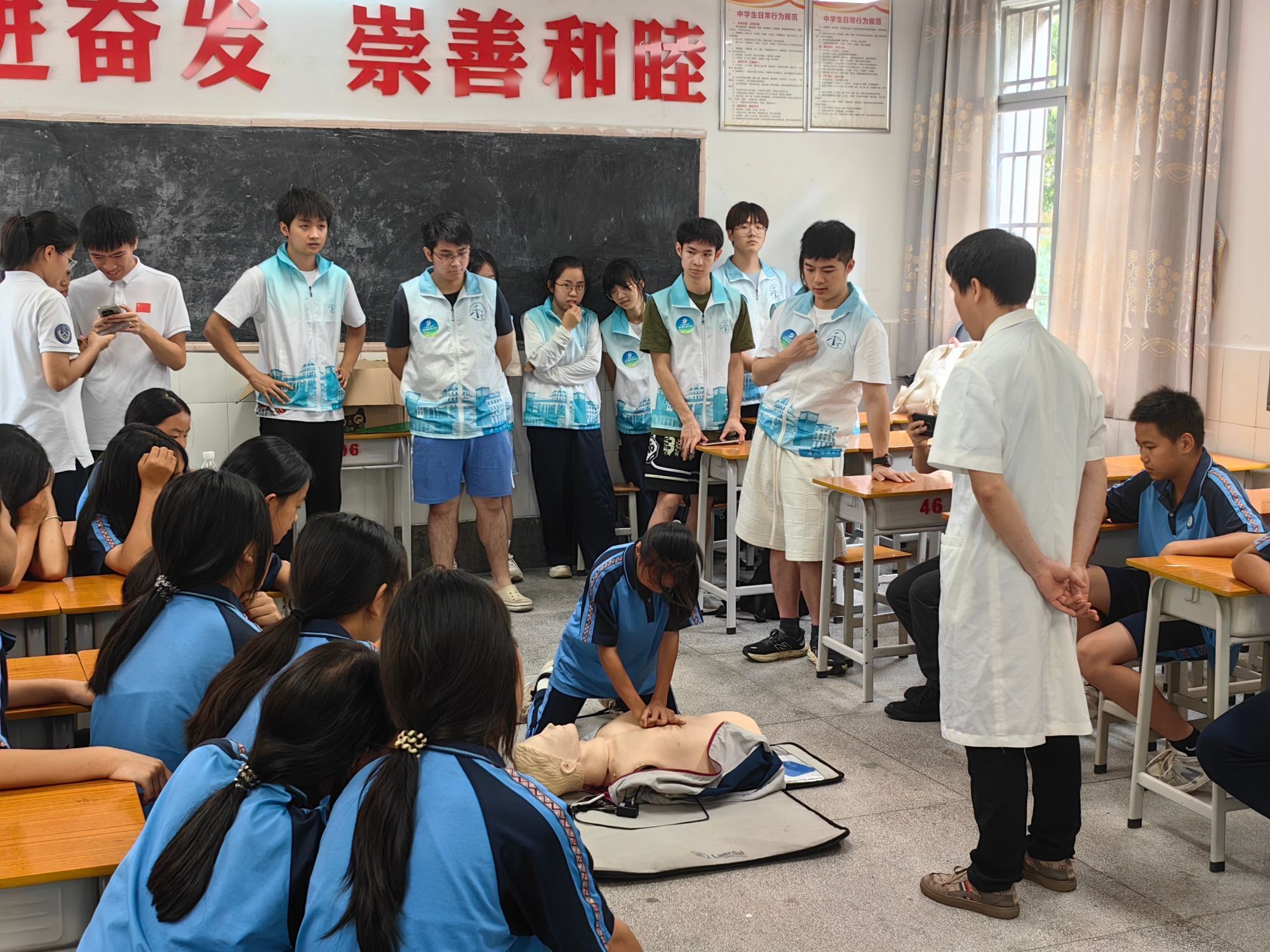 此次活动以“医心护航、青春筑梦”为主题,将专业实践与家国情怀深度融合,让志愿者们在服务基层群众中践行使命担当。开云kaiyun官方网站学生志愿者化身“急救教官”,在连山壮族瑶族自治县永和镇永和中学的课堂上,细致演示心肺复苏(CPR)的标准动作,向学生们精准讲解操作要点,包括按压深度需达5厘米至6厘米、频率保持每分钟100次至120次等关键知识。结合夏季农村场景的实际需求,活动在往年基础上优化培训内容,新增溺水急救、中暑处理等实用技能。通过“理论讲解+模拟操作+分组PK”的创新模式,让学生们在互动中掌握要领。不少学生在实操后表示,从前面对紧急情况只会慌乱,如今掌握了急救技能,感觉自己在关键时刻也能挺身而出成为救人“小英雄”。