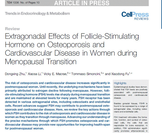 该综述在课题组前期工作积累的基础之上,结合国际前沿进展,系统阐述了卵泡刺激素(FSH)对于围绝经期/绝经后女性骨质疏松和心血管疾病发生的影响,分析了其内在的分子信号机制,指出了后续的研究发展方向。该综述有助于引发国际相关学术学界对FSH性腺外组织作用的重视,加大研究投入力度,最终为降低绝经后女性骨质疏松和心血管疾病发病率提供新的干预途径。