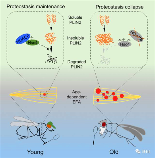 该研究首次在果蝇中发现脂肪过度积累直接导致提前衰老,同时揭示了其背后的调控机制:组蛋白去乙酰化酶HDAC6的功能下调导致分子伴侣蛋白dHsc4的乙酰化水平上调,最终结果是导致一个重要的脂滴蛋白PLIN2的蛋白稳态发生改变,这直接引起脂肪过度积累的形成,最终影响衰老相关机体的整体机能。
