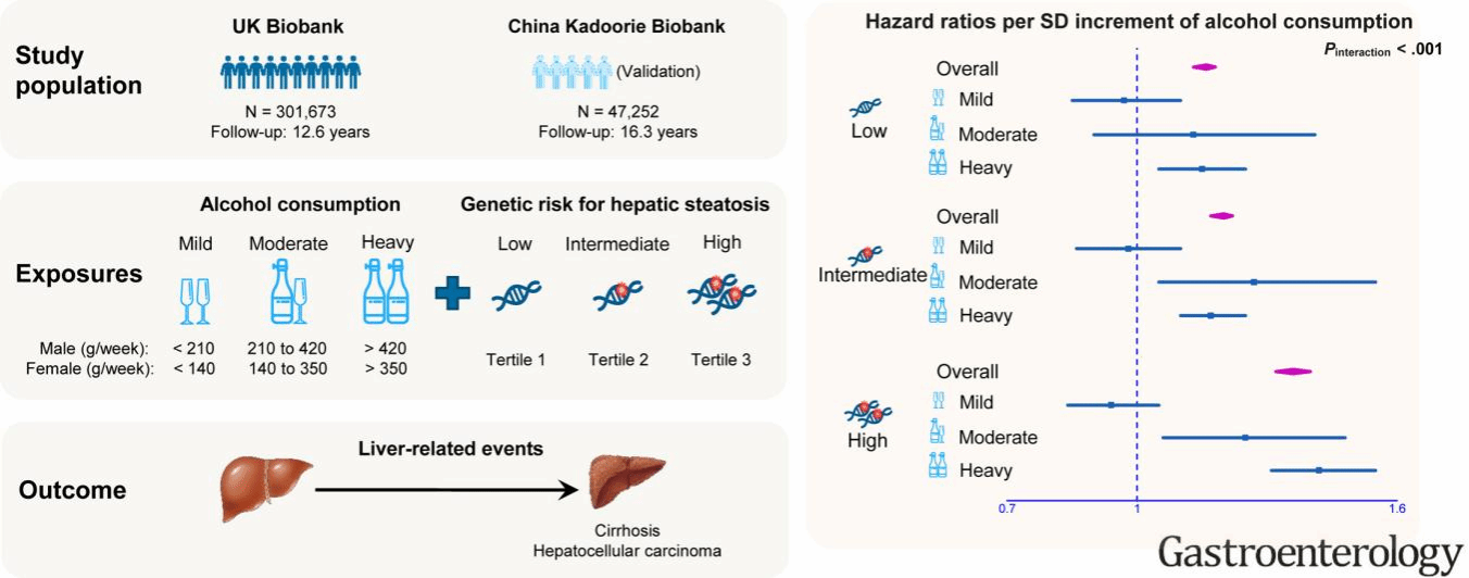 肝脏疾病每年造成全球200万人死亡,占死亡总数的4%,其中大部分死因是肝硬化和肝癌等肝脏相关事件。酒精摄入和脂肪性肝病是全球肝脏疾病的主要病因,新的脂肪性肝病分类标准将酒精摄入量划分为轻度(女性 <140 克 / 周,或男性 < 210 克 / 周)、中度(女性 140-350 克 / 周,或男性 210-420 克 / 周)、重度(女性> 350 克 / 周,或男性 > 420 克 / 周)三类。然而目前关于不同类别的酒精摄入量与肝脏相关事件之间的关联尚未明确,脂肪肝遗传易感性与饮酒之间的相互作用是否会进一步增加肝脏相关事件的风险仍不清晰。研究基于英国生物银行(301,673名参与者,随访 12.8 年)和中国慢性病前瞻性研究(47,252 名参与者,随访 16.3 年)两个大型人群队列展开研究,系统评估了酒精摄入、脂肪肝遗传易感性与肝脏相关事件的关联,并进一步分析了饮酒与基因之间的交互作用。结果发现:轻度饮酒与肝脏相关事件无显著关联,而在中度及重度饮酒者中,酒精摄入每增 1 个标准差,事件风险分别增加 23%(HR=1.23)和 18%(HR=1.18)。酒精摄入量与脂肪肝遗传易感性存在显著交互作用(P<0.001),中度和重度饮酒与肝脏相关事件的关联在遗传易感性高的人群中更显著。而具有高遗传风险且重度饮酒者的肝脏相关事件风险较低遗传风险且轻度饮酒者升高 6.5 倍(HR=6.50),相对超额风险(RERI)达 2.34。该发现在中西方人群中都得到了验证,表明PNPLA3、TM6SF2等基因变异可能通过影响脂质代谢与酒精协同加重肝损伤,提示需根据脂肪肝遗传风险制定个性化干预措施以预防肝硬化及肝癌,研究为人群慢性肝脏疾病的精准防治提供了科学依据。