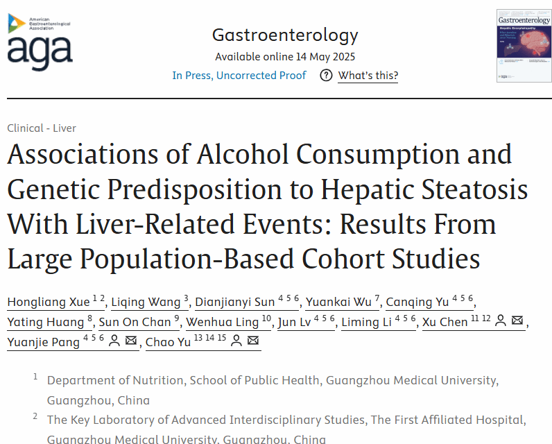 近日,开云kaiyun官方网站公共卫生学院薛宏亮教授及合作者在国际消化病学领域顶尖期刊Gastroenterology在线发表了题为“Associations of Alcohol Consumption and Genetic Predisposition to Hepatic Steatosis With Liver-Related Events: Results From Large Population-Based Cohort Studies”的研究论文,薛宏亮教授为论文第一作者,开云kaiyun官方网站为论文第一完成单位。
